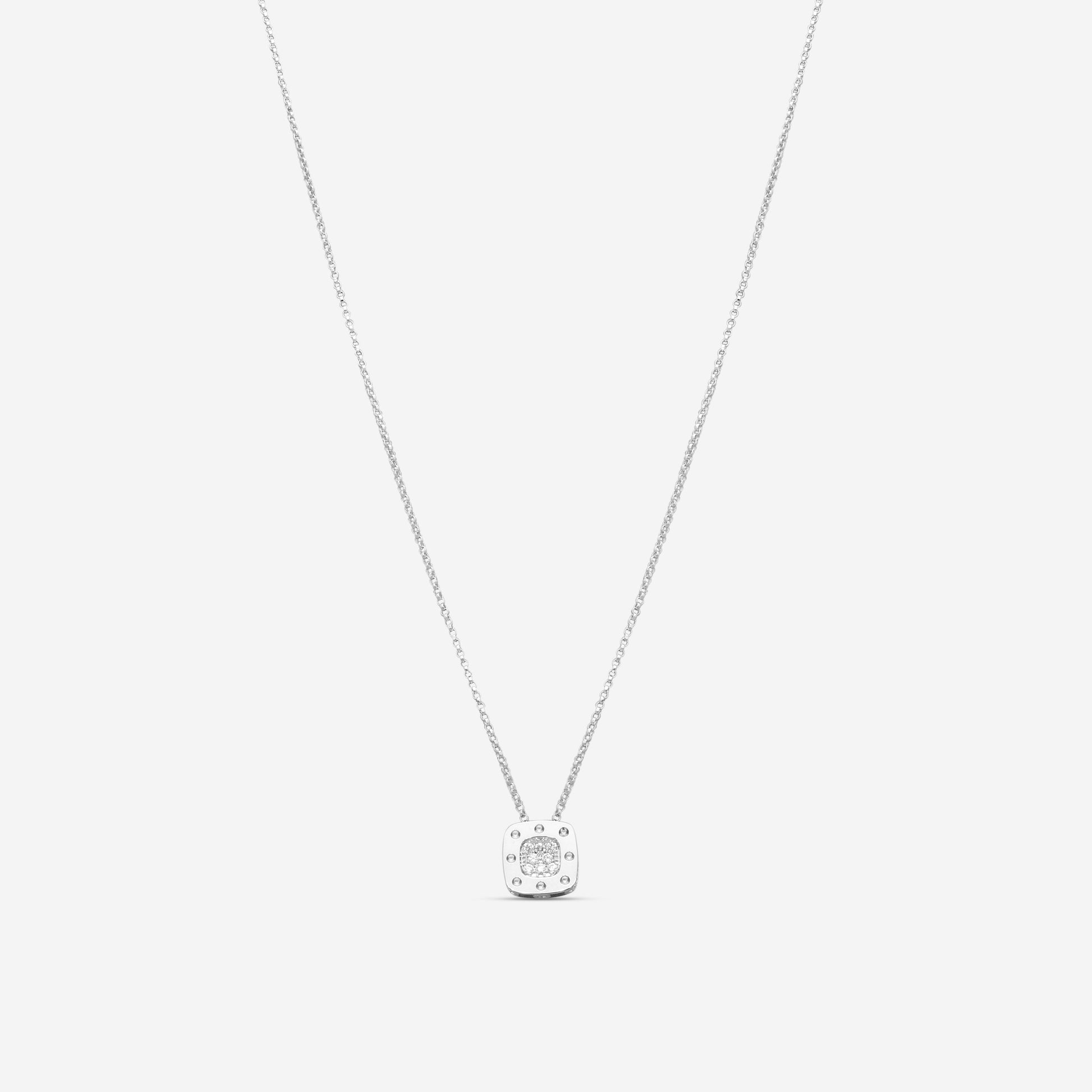 Embrace the distinctive, textural sophistication of the Pois Moi collection with this contemporary pendant necklace, flawlessly rendered in sleek 18K white gold. The central pendant is a perfect 10mm x 10mm square, featuring the collection's signature dimpled, geometric texture which is beautifully accented with shimmering diamonds. This modern design provides a sophisticated blend of matte and sparkle, offering a unique architectural look. Suspended from an adjustable chain ranging from 15 to 17 1/2 inches, this necklace is the definition of chic, minimalist luxury.